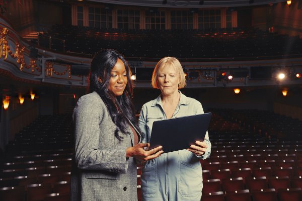 La discípula en Teatro Whitney White durante una sesión de trabajo con su mentora Phyllida Lloyd en el Aldwych Theatre en Londres. © Rolex / William Lacalmontie