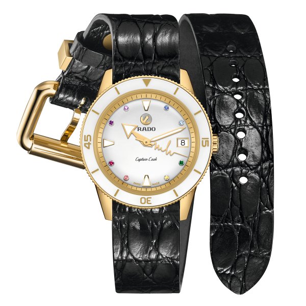 Esta nueva y exclusiva versión del Captain Cook aporta la energía y la alegría de Marina a esa familia de relojes mediante un colorido arcoíris de ocho piedras preciosas e índices, detalles con revestimiento PVD a modo de contraste, el famoso cristal de zafiro en forma de caja, la incrustación de cerámica de alta tecnología de color blanco del bisel giratorio y, por supuesto, las inconfundibles correas de Marina Hoermanseder. En el centro del nuevo reloj, un segundero enormemente original, que imita la forma de un latido y la firma de la propia Marina, marca el paso del tiempo de forma elegante y alegre. Además, los marcadores y cifras metalizadas de color dorado grabados con laser combinan maravillosamente con el revestimiento PVD de oro amarillo pulido de la caja y del bisel en acero inoxidable. El cuadrante con el símbolo del ancla móvil dorada sobre el fondo plateado y los logos Rado y Captain Cook gris oscuro son protegidos por el sublime cristal de zafiro combado bien conocido por los amantes de los relojes Captain Cook. Este cristal tiene tratamiento antirreflejo sobre ambas caras y las agujas de las horas y los minutos están revestidas de Super-LumiNova® blanco para maximizar su legibilidad.