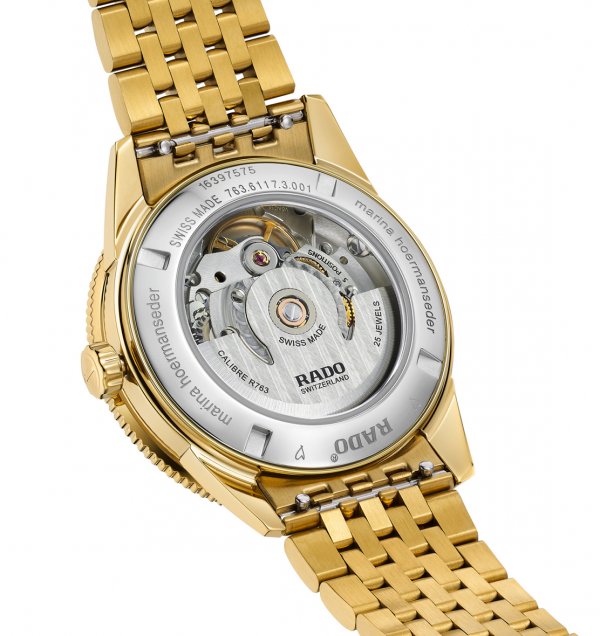 En el interior, un movimiento automático Rado R763 con 25 rubíes, tres agujas y una ventanilla de fecha a las 3 horas destaca la ogininalidad de este modelo aportando un toque de precisión relojera. Gracias al espiral antimagnético Nivachron™, este guardatiempo dispone de una reserva de marcha de 80 horas, ajustado sobre cinco posiciones. Otro cristal de zafiro en el fondo de la caja permite admirar el mecanismo de esta versión Marina Hoermanseder muy original del Captain Cook, estanco hasta 100 m. Se presenta con tres brazaletes diferentes. El primero en acero inoxidable con revestimiento PVD color oro amarillo tipo grano de arroz pulido/cepillado con un triple cierre desplegable en acero inoxidable pulido. El segundo es un brazalete NATO en cuero negro doble vuelta (con motivo alligátor) con el cierre característico de Marina en acero inoxidable con revestimiento PVD color oro amarillo. El tercero es un brazalete en cuero negro de largo estándar, con el mismo motivo de alligátor, y una hebilla ardillón en acero inoxidable con revestimiento PVD color oro amarillo.
