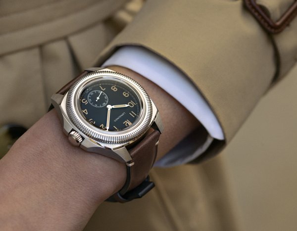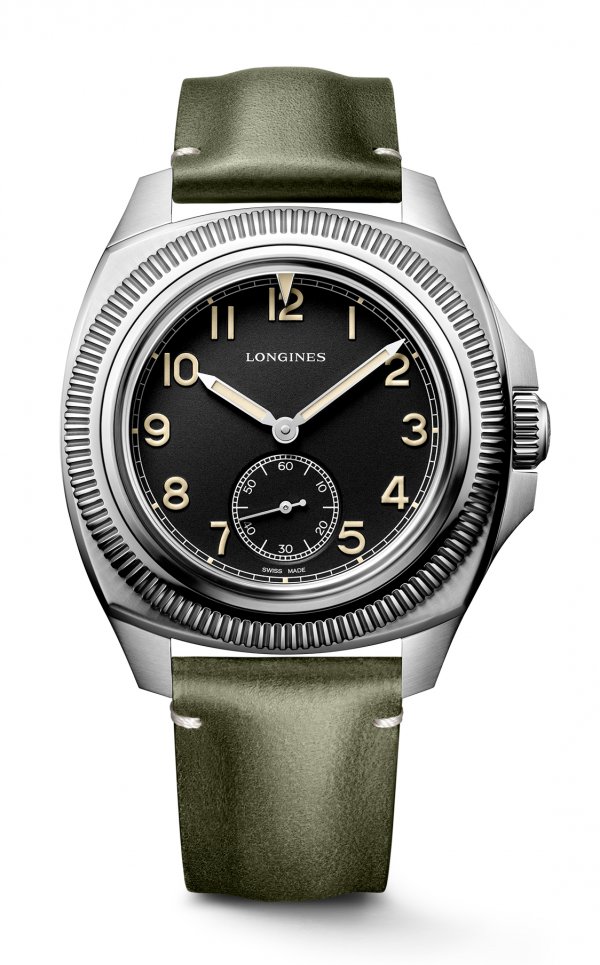 La curvatura de la forma en cojinete de su caja enfatiza su diseño único, registrado el 1 de abril de 1935 en la Oficina Nacional de la Propiedad Industrial en Berna (Suiza). Aunque estaba destinado a la aviación, este reloj ya logró conquistar a un público general en busca de un reloj fiable, sólido, preciso y de lectura fácil. El nuevo Longines Pilot Majetek incluye características técnicas y ergonómicas totalmente renovadas. Se han revisado sus proporciones, su forma original con el cojinete ligeramente arqueado y sus cantos más redondeados para responder a las tendencias actuales. Su diámetro de 43 mm hace que sea cómodo de llevar. A las 9, el exterior de la caja de acero con fondo atornillado incluye una placa conmemorativa que reza «1935». Remite a la fecha original del primer modelo Longines «Majetek», y esconde un mecanismo de engranajes patentado de nuevo. El sistema de bisel giratorio externo acanalado garantiza una estanqueidad de hasta 10 bares (100 metros) acoplado con un triángulo de referencia móvil fluorescente, o «Starting time indicator». Este se encuentra bajo el cristal de zafiro, aunque es independiente, y se sitúa por encima de la esfera. En el modelo de 1935, bisel y cristal con referencia incluida giraban como bloque único. Hoy, el cristal de zafiro se queda fijo y contribuye a la estanqueidad de la nueva caja.