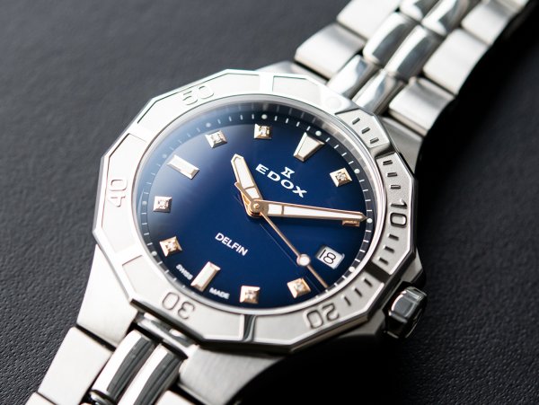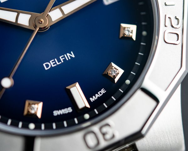 El nuevo Edox Delfin Edición Especial, al igual que el original, es sumergible hasta una sorprendente profundidad de 200 metros. Pero este modelo exhibe un toque mucho más femenino: la esfera azul profundo resplandece con doce diamantes relucientes y está protegida por un cristal de zafiro anti-reflejos e irrayable. Con 38 milímetros, el nuevo Edox Delfin no es muy voluminoso, y sus asas flexibles permiten adaptarse sin problemas a muñecas pequeñas o grandes. El llamativo bisel de 12 lados se remonta a un diseño distintivo presentado por primera vez por Edox en 1973. Con poca luz, o bajo el agua, la hora puede ser leída con claridad gracias a las agujas cubiertas con Super-LumiNova. Deportivo y elegante, el Edox Delfin Diver Date Lady Special Edition, ensamblado a mano, es un reloj creado por campeones para campeones de todos los ámbitos de la vida.