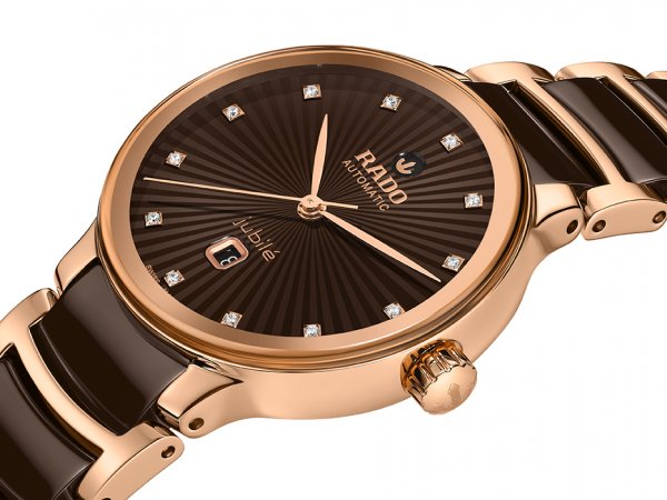 El logo Rado es más grande que en las versiones anteriores en el nuevo Centrix, mientras que la inscripción «Jubilé» hace su regreso en los modelos engastados de piedras preciosas en los índices. La marca del ancla en la corona ha sido tratada con láser para hacerla más visible. Los lados de la caja ya no son cilíndricos, sino magníficamente combados para combinar mejor con el diseño más suave y de fusionar sutilmente con el fondo de la caja rediseñado: nueva geometría, menos marcas y número de serie grabado con láser. Todos los modelos automáticos están dotados de un fondo de la caja de cristal de zafiro que permite apreciar el movimiento de alta calidad con espiral Nivachron™ y su masa oscilante. Los modelos más pequeños y los más grandes disponen respectivamente de una reserva de marcha de 48 horas y de 80 horas, con una precisión testeada en 5 posiciones.