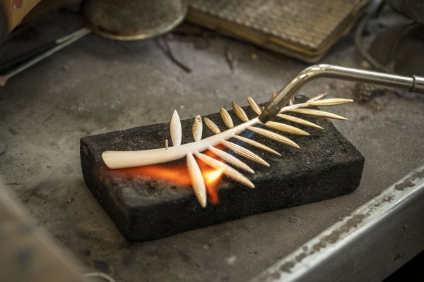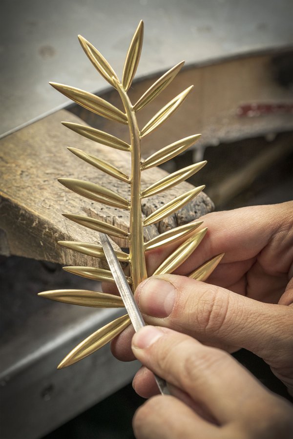 El secreto de la fabricación de esta famosa Palma se encuentra en la pericia de los talleres ginebrinos de Chopard. Se requieren nada menos que setenta horas de trabajo para llevar a cabo la labor de producir de principio a fin el galardón supremo. Para que el resultado sea perfectamente homogéneo, el mismo joyero lleva a cabo todo el proceso de producción de la pieza con la ayuda de seis artesanos que van interviniendo a lo largo de las distintas etapas de su elaboración. El oro se funde primero en el taller de la Casa y luego se vierte en un molde en el que la palma ha sido modelada en cera. Esta técnica, conocida como «fundición a la cera perdida», permite obtener una rama dorada después de que la cera se ha fundido durante su paso por un horno. A continuación, el joyero la recorta, la limpia y la pule desde todos los ángulos, la fija en su cojín de cristal de roca y, por último, está lista para ser entregada ante las cámaras de todo el mundo, puesto que el Festival de Cannes es el acontecimiento más mediático del mundo después de los Juegos Olímpicos. Al igual que la Palma de Oro, los otros ocho premios que se entregan en la ceremonia de clausura -el Premio a la Interpretación Femenina, el Premio a la Interpretación Masculina, el Gran Premio, el Premio a la Dirección, el Premio al Guion, el Premio del Jurado, la Palma de Oro al Cortometraje y la Cámara de Oro- también se realizan en los talleres de Alta Joyería de Chopard. Emblema indiscutible de la famosa cita cinematográfica, la Palma de Oro sigue siendo el símbolo de la extraordinaria relación que une a este joyero con el Festival de Cannes y que se podría resumir con una sola frase: «Chopard Loves Cinema».