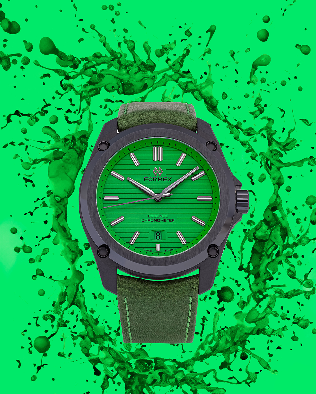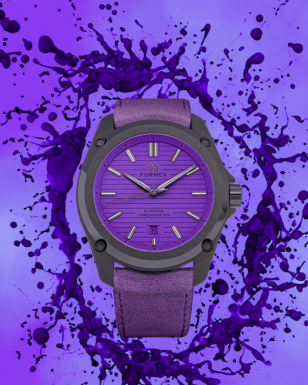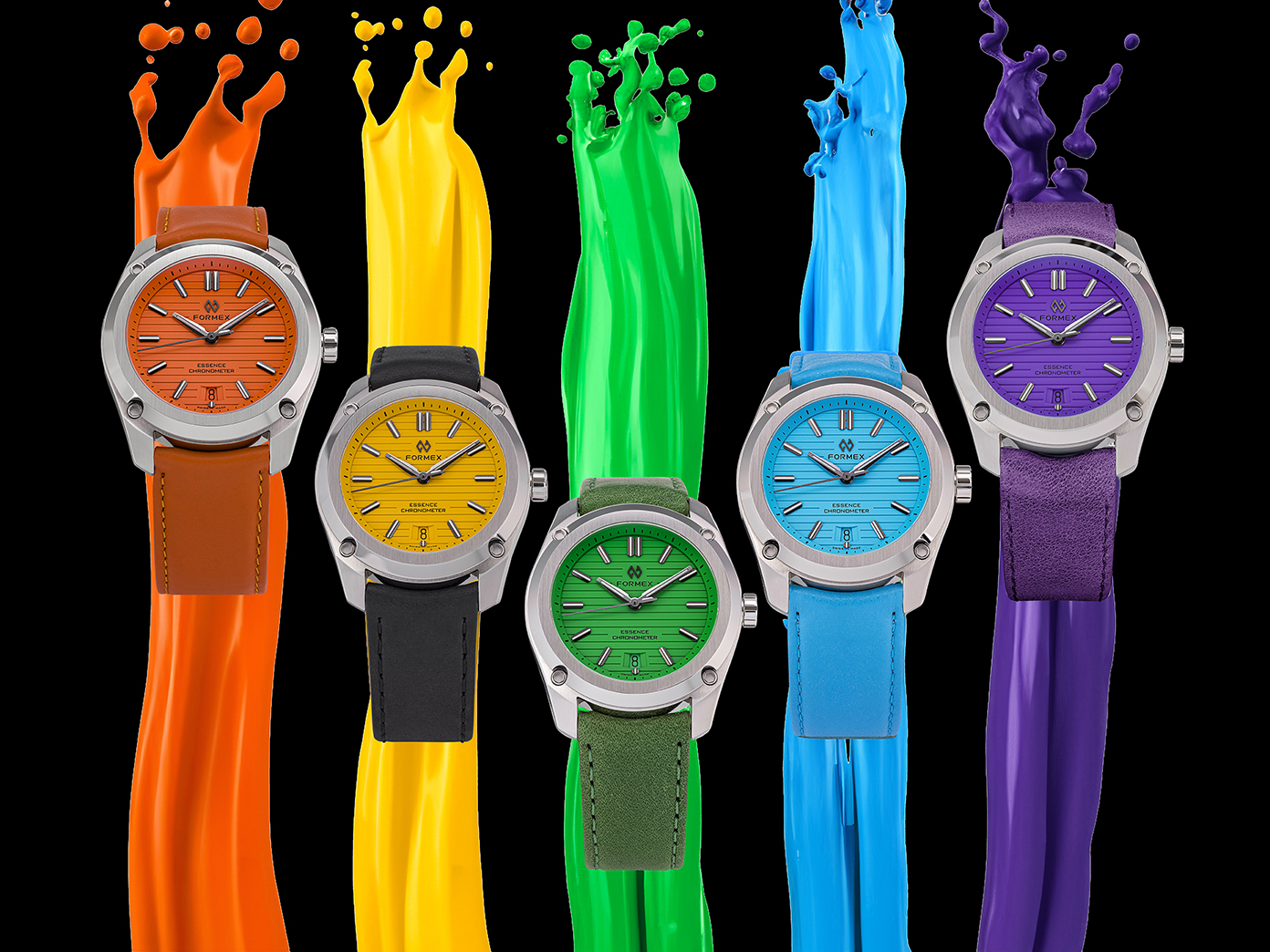 La nueva colección Splash es lanzada en cantidad de producción limitada en ambos, el Essence 39 mm Automatic Chronometer con caja de acero inoxidable, y el ultra-ligero Essence 43 mm Leggera con caja en carbono y cerámica. Ambas versiones cuentan con la suspensión de caja patentada de Formex, un sistema único con cuatro resortes integrados que se adaptan al movimiento de la muñeca del usuario para mejorar notablemente la comodidad. El cierre desplegable patentado de Formex posibilita al usuario ajustar, sin esfuerzo y gradualmente, las correas de cuero, nylon o caucho más de 7 milímetros mientras usa el reloj, asegurando un confortable ajuste que se acomoda a las variaciones en el tamaño de la muñeca causados por la actividad y el clima. El brazalete de acero inoxidable altamente articulado consta de un cierre mariposa totalmente integrado con una micro-extensión oculta de 4 milímetros. Todas las correas pueden ser intercambiadas sin necesidad del uso de herramientas.