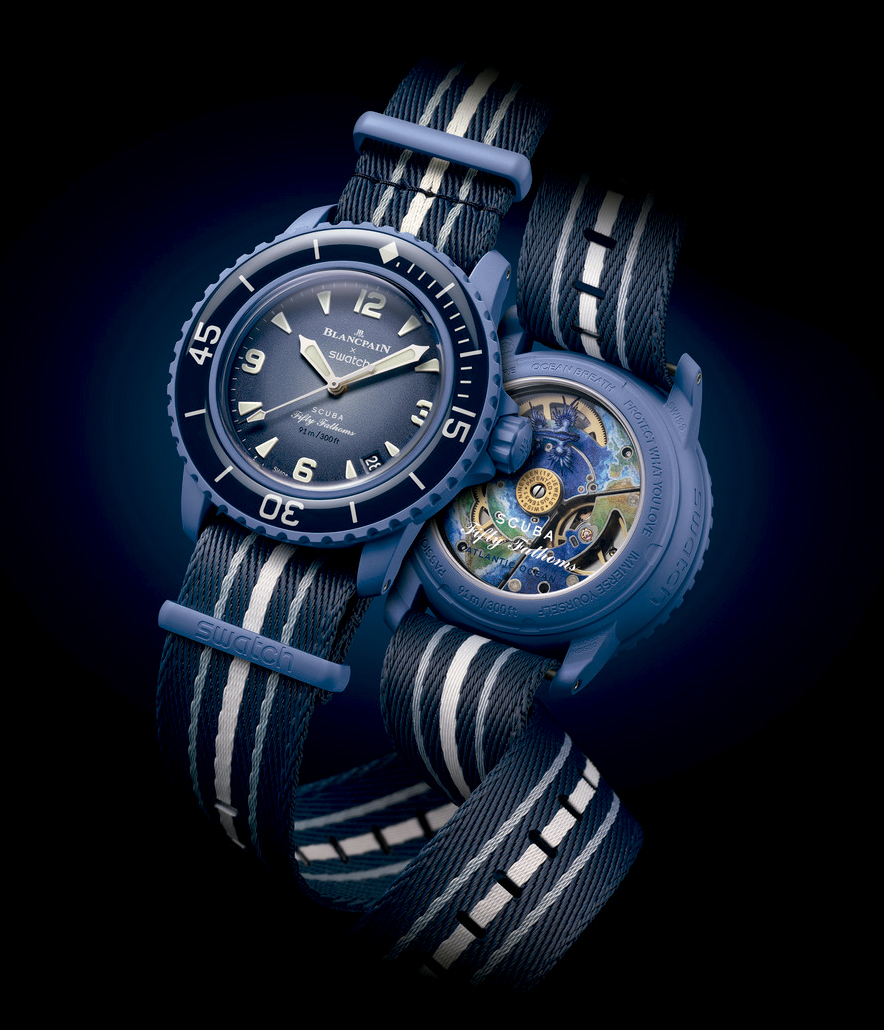 En esta nueva colaboración, Swatch celebra este icónico reloj a través de cinco modelos emblemáticos con el característico toque alegre y divertido de Swatch. La colección –no limitada– ha sido bautizada con el nombre de Bioceramic Scuba Fifty Fathoms, haciendo referencia a los relojes de submarinismo Scuba de Swatch. Los relojes que la componen reproducen fielmente todas las señas de identidad del Fifty Fathoms original: resistencia acuática superior, legibilidad excepcional, movimiento mecánico, bisel giratorio seguro y protección antimagnética. Blancpain y Swatch se han inspirado en las profundidades marinas y han desarrollado una colección de cinco modelos Swatch cuyos nombres aluden a los diferentes océanos de nuestro planeta: Arctic Ocean, Pacific Ocean, Atlantic Ocean, Indian Ocean y Antarctic Ocean. Fiel a la forma que debe tener un buen reloj de submarinismo, los relojes de la colección Bioceramic Scuba Fifty Fathoms se pueden sumergir en aguas profundas de hasta 91 metros. De hecho, esa cifra, el 91, es otro de los guiños que Swatch hace a Blancpain: cincuenta brazas (fifty fathoms, en inglés) equivale a 91 metros o 300 pies, la medida histórica de profundidad que se usa en el mundo anglosajón.