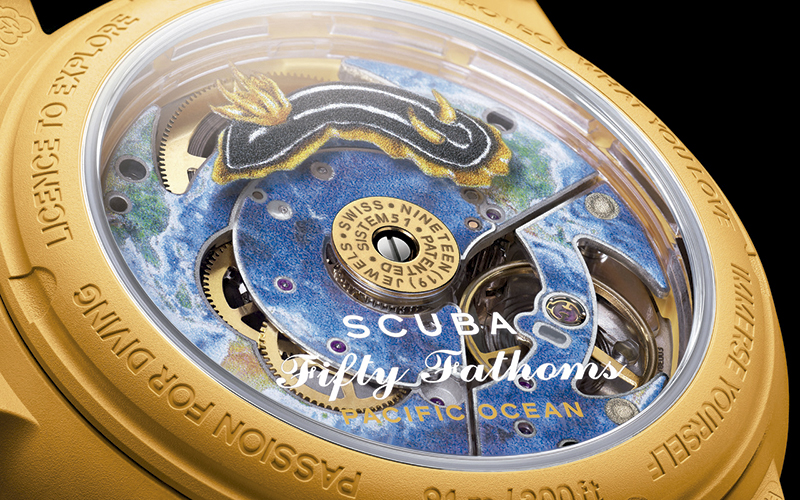 La colección Bioceramic Scuba Fifty Fathoms está equipada con un movimiento mecánico de Swatch llamado SISTEM51. Este es el primer y único movimiento mecánico cuya producción está totalmente automatizada. Es antimagnético gracias a su espiral Nivachron™ y está fabricado con solo 51 piezas, incluido un tornillo central. Su mecanismo tiene una reserva de marcha de 90 horas. En 2013, SISTEM51 revolucionó el mundo de los relojes automáticos al mostrar su mecanismo por dentro: «por delante dice la hora y por detrás cuenta una historia». La historia que Swatch cuenta en los cinco relojes de esta colección y que se aprecia en su parte trasera está protagonizada por un animal magnífico y colorido que vive en nuestros cinco océanos: el nudibranquio (nombre científico: Nudibranchia). Estos animales aparecen impresos digitalmente en el rotor del movimiento, la pieza que hace que el reloj se recargue automáticamente al mover la muñeca. En el reloj Arctic Ocean encontramos el nudibranquio Dendronotus Frondosus, de formas suaves y sutiles. En el Pacific Ocean se muestra el Chromodoris Kuiteri, que con sus colores brillantes como el sol, evoca las aguas cálidas y celestes del océano en el que se encuentra. El Atlantic Ocean cuenta con un Glaucus Atlanticus, cuyos colores azul oscuro rinden homenaje a los mares salvajes. Pero, si bien pretende encarnar la fragilidad de la vida marina, esta especie es venenosa y recibe el apodo de «dragón azul». El Indian Ocean, con su Nembrotha Kubaryana, sugiere los colores hipnotizantes de los corales, así como los de las aguas de su océano, tan exuberantes como deslumbrantes. Por último, el Antarctic Ocean muestra un Tritoniella Belli, cuya apariencia de iceberg golpeado por una tormenta emula el misterio y el encanto de las gélidas aguas polares. Además de estos nudibranquios, –que viven realmente en los océanos que dan nombre a los diferentes modelos–, cada reloj lleva detrás una representación del océano en el que se inspira.
