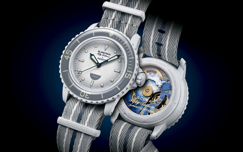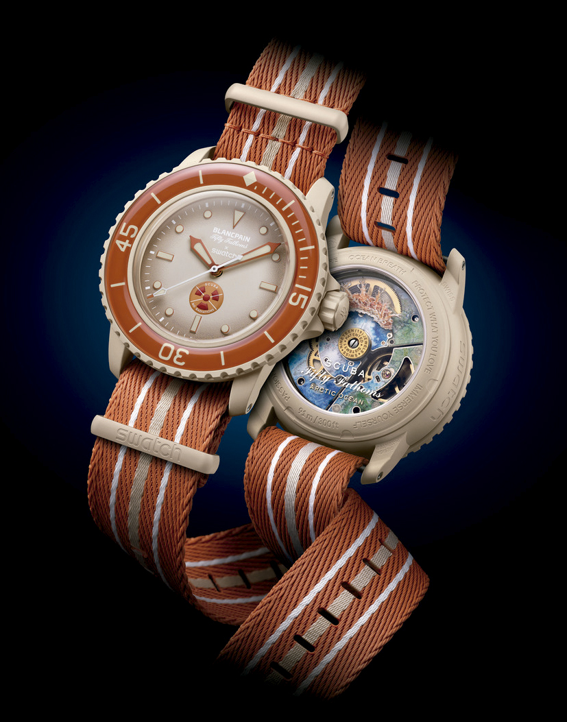 Todos los modelos de esta colaboración entre Swatch y Blancpain, ambas marcas del Swatch Group, están fabricados con Bioceramic. Este material único, patentado por la marca, está compuesto por dos tercios de cerámica y un tercio de material de origen biológico derivado del aceite de ricino. Como muestra del compromiso con la preservación de los océanos, sus correas NATO están fabricadas con redes de pesca recicladas que se han extraído del mar. En lo que a simbología se refiere, el logotipo compartido Blancpain X Swatch aparece tanto en la esfera como en la corona de los relojes. También la palabra Swatch aparece inscrita en la caja, al igual que hace la marca Blancpain en sus relojes Fifty Fathoms originales. Además, la parte trasera de los relojes de esta colección muestra las siguientes frases inspiradoras: Passion for diving, Licence to explore, Ocean Breath, Protect what you love e Immerse yourself. El modelo Arctic Ocean incorpora un símbolo muy especial en su esfera que no dejará indiferentes a los fans más apasionados del Fifty Fathoms: el conocido trébol rojo sobre fondo amarillo que se utiliza para indicar la radiación y que aparece tachado por una cruz blanca. Debajo de él se puede leer «No Radiations», una inscripción que ayuda a reforzar el mensaje de que el reloj no contiene radio en homenaje a los modelos icónicos de los años sesenta, en cuyas esferas se podía leer este mensaje. Desde entonces, estos relojes se han convertido en codiciadas piezas de coleccionista que hoy forman parte del patrimonio legendario de Fifty Fathoms. Otra de las referencias dignas de mención se encuentra en el modelo Antarctic Ocean: un indicador real de contacto con el agua que detecta la presencia de agua y que Blancpain lleva incorporando desde 1954 en algunos de los modelos que vende a clubes de submarinismo y unidades militares. Situado a las 6 en punto, este sensor garantiza que la resistencia acuática del reloj no se ha visto afectada por el uso de ningún submarinista anterior (ya que, si percibiera rastros de humedad, cambiaría de color). Varios modelos del Fifty Fathoms que incorporan este sensor bicolor llevan, además, la denominación MIL-SPEC (military specifications), haciendo referencia a las especificaciones de la Marina estadounidense.