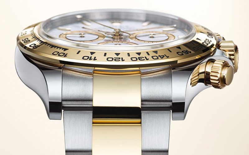 La versión del Cosmograph Daytona en platino 950, reconocible por su esfera azul glaciar, está dotada de un brazalete Oyster. Las modalidades en acero Oystersteel y en versión Rolesor amarillo (combinación de acero Oystersteel y oro amarillo), ambas provistas de una esfera lacada blanca, así como la modalidad en oro Everose de 18 quilates con esfera negro vivo y contadores Sundust, están equipadas con este mismo brazalete de tres elementos. Desarrollado a finales de la década de 1930, sigue siendo el más extendido de la colección Oyster Perpetual y destaca por su robustez. Por su parte, la nueva modalidad en oro amarillo de 18 quilates con esfera dorada y contadores negro vivo está dotada de un brazalete Oysterflex. Desarrollado por Rolex y patentado, este innovador brazalete está formado por dos láminas metálicas combadas y flexibles –una para cada uno de los ramales– revestidas de elastómero negro de alto rendimiento.