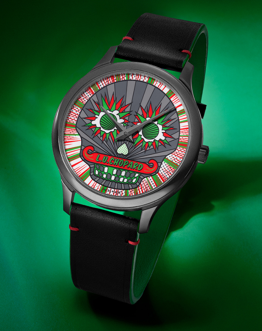 El L.U.C Skull One Calavera Pop Art es un reloj de acero inoxidable ennegrecido que funciona gracias a un exquisito movimiento mecánico. Además, es extraplano, su caja solo tiene 7,2 mm de grosor. Pero, sin embargo, será recordado por su sorprendente y colorida interpretación de la tradición del Día de los Muertos, elegantemente visualizada por los artesanos de Chopard. Su esfera gráfica presenta un calco de un motivo de calavera en los tonos de la bandera nacional mexicana lo cual le confiere su carácter inconformista y un toque de arte pop. Por su parte, el color negro de la caja tratada con DLC (Diamond Like Carbon) y de las agujas dauphine para las horas y los minutos crea un contraste radicalmente tenebroso. El aspecto kitsch de los motivos de la Fiesta de los muertos se encuentra incluso en el estilizado logo L.U.Chopard insertado en el bigote y que evoca al fundador de la Casa, Louis-Ulysse Chopard. El reloj se presenta con una correa de cuero de becerro negro con forro verde y pespuntes rojos y verdes en referencia a los vivos colores de la esfera. La hebilla de acero también ha sido tratada con DLC negro.
