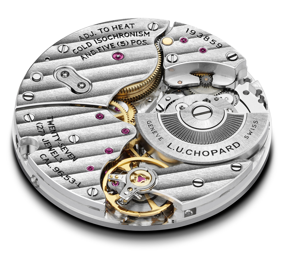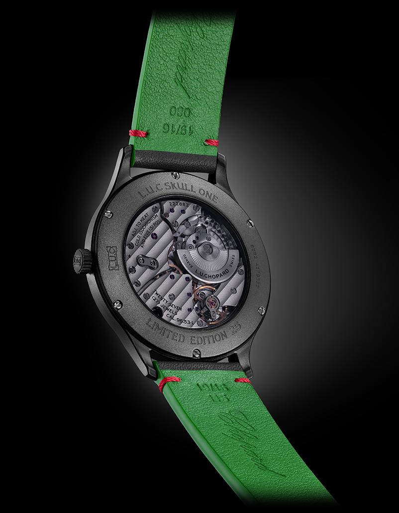 Tras la alegre esfera del L.U.C Skull One Calavera Pop se encuentra el movimiento Chopard L.U.C 96.53-L, un lujoso calibre automático ultraplano diseñado y ensamblado en los talleres de Chopard Manufacture en Fleurier. Gracias a la Tecnología Twin de Chopard, mediante la cual dos barriletes coaxiales trabajan en secuencia, el movimiento proporciona 58 horas de reserva de la marcha. Además, está dotado de una espiral de curva terminal plana montada sobre un volante que oscila a 28,800 A/h (4hz). Los puentes del movimiento están bellamente adornados a mano con Côtes de Genève. Estos componentes, junto con el microrrotor de aleación de tungsteno del movimiento, son visibles a través de un fondo de cristal de zafiro ligeramente tintado elegido para aumentar la sensación de que el Día de los Muertos su usuario podrá echar un vistazo a un reino misterioso e infinitamente cautivador.