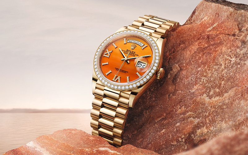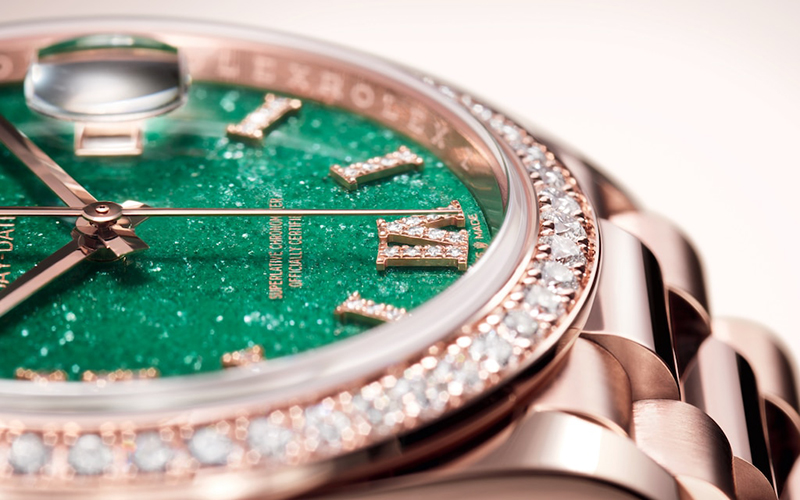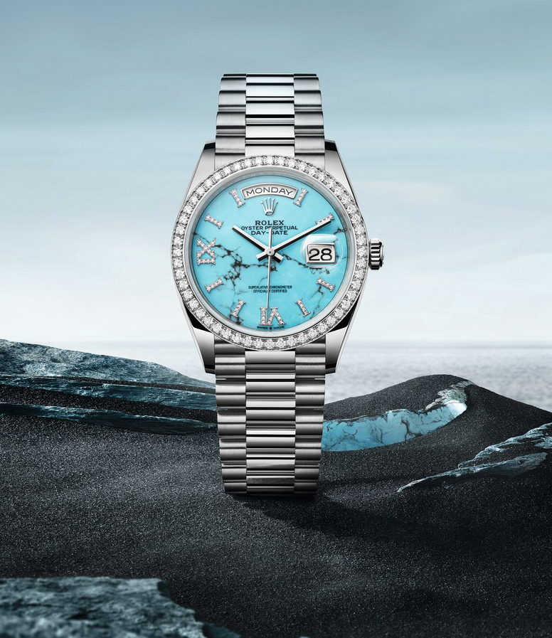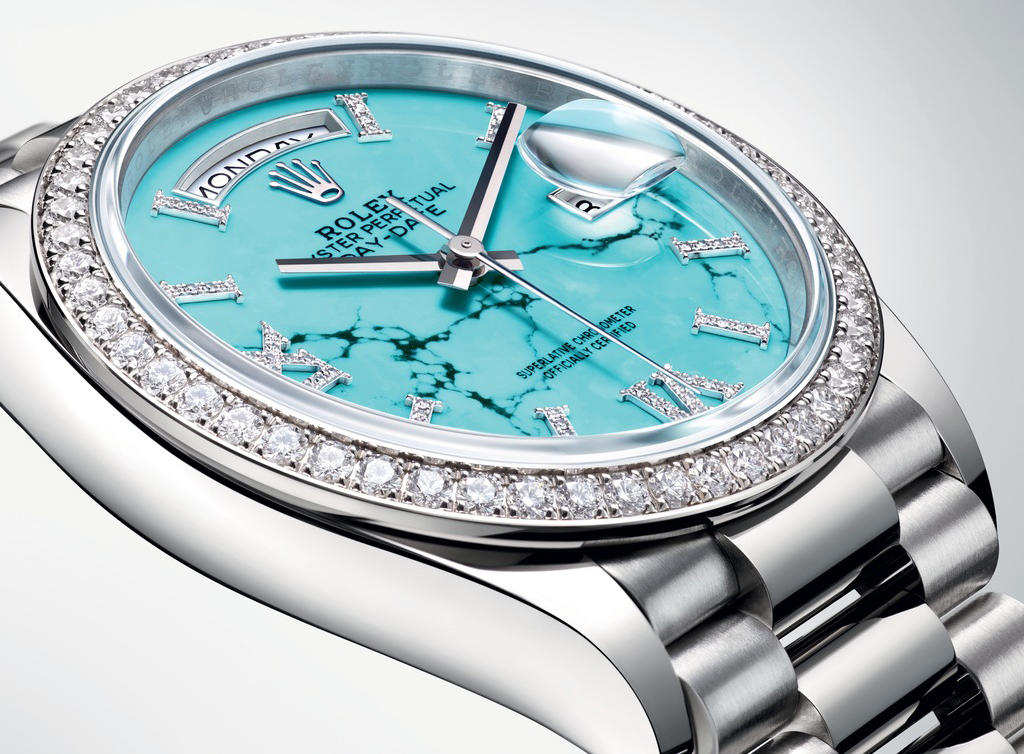 olex lanzó este año tres nuevas versiones del Oyster Perpetual Day-Date 36 que exhiben luminosas esferas en piedra ornamental ataviadas con índices y números romanos VI y IX engastados con diamantes. Fabricada en oro Everose de 18 quilates, la primera modalidad presenta una esfera de venturina verde con una superficie delicadamente cristalizada. La segunda es de oro amarillo de 18 quilates y su esfera está tallada en cornalina, una piedra anaranjada que se distingue por líneas de formas y grosores variables que componen una sutil escala cromática. La tercera, en oro blanco de 18 quilates, luce una esfera de turquesa salpicada de vetas naturales. Las tres están dotadas de un bisel engastado con 52 diamantes talla brillante y provistas del emblemático brazalete President, dotado del elegante cierre invisible Crownclasp.