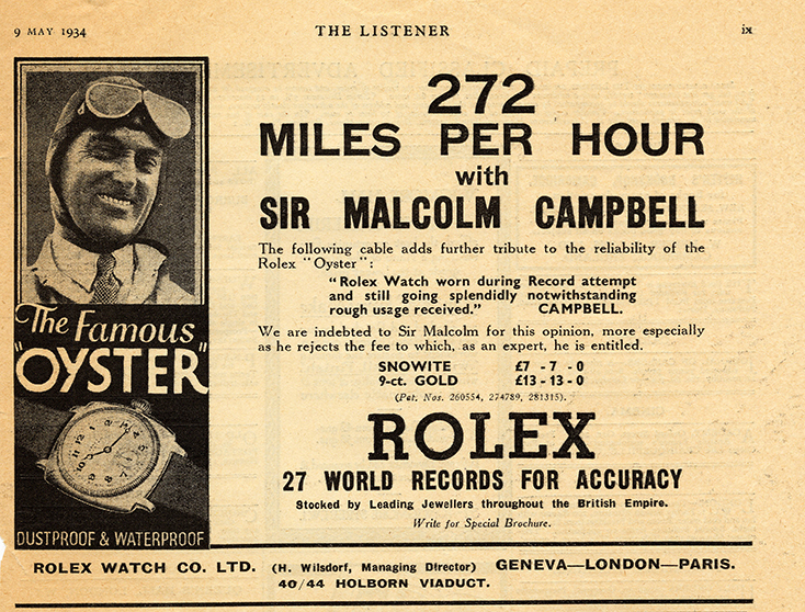 En marzo de 1935, a la edad de cincuenta años, Sir Malcolm estableció lo que sería la velocidad más rápida en las místicas costas de Daytona, compitiendo a 276.7 mph (445.5 km/h), antes de romper la barrera de las 300 mph (483 km/h) en Bonneville Salt Flats, Utah, posteriormente ese año. Desafiando contínuamente los límites del esfuerzo humano, Sir Malcolm se convirtió en el primer Testimonial de Rolex del deporte motor, allanando el camino para la siguiente generación de talentos en su lucha por alcanzar la excelencia.
