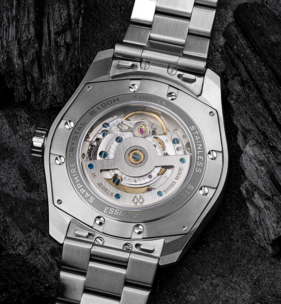 Formex aumentó aún más el grosor de la esfera para permitir soldar los pies de la esfera, que fijan la esfera al movimento, directamente al meteorito. El proceso estándar cuando se trabaja con esferas de piedra es pegar la esfera de piedra sobre una placa de latón. Tener una esfera de meteorito más gruesa permitió a Formex forjar una ventana de fecha biselada, un elemento de diseño característico en todos los relojes Formex. Este desarrollo es producto de la intensa creación de prototipos llevados a cabo en la fábrica de cuadrantes de Formex situada en las montañas suizas del Jura.