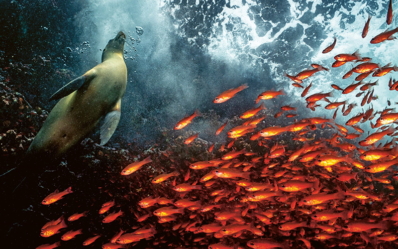 Un cardumen de peces cardenal huye de un león marino de las Galápagos. Las Islas Galápagos son una de las zonas con mayor biodiversidad del planeta. En enero de 2022, la Reserva Marina Hermandad incorporó sesenta mil kilómetros cuadrados a la zona de exclusión pesquera que rodea las islas, lo que representa un aumento del 5,9 % de la zona oceánica protegida de Ecuador. © Cristina Mittermeier