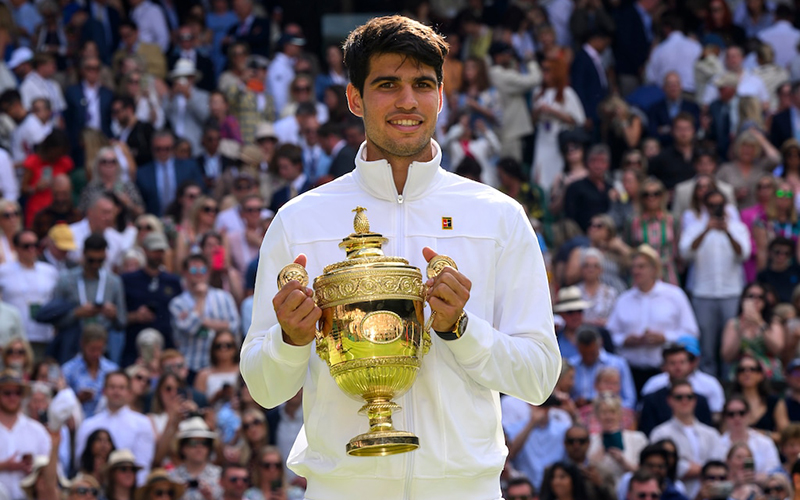 E l domingo 14 de julio, el Testimonial Rolex Carlos Alcaraz se alzó con la victoria en The Championships, Wimbledon, y así se aseguró su segundo título individual masculino consecutivo. En la Cancha Central, el joven español cautivó a un público de 15.000 espectadores con una demostración de su inmenso talento, precisión y audacia que le permitieron conquistar la victoria, por 6-2, 6-2 y 7-6, en 2 horas y 21 minutos. Con este, su cuarto título de Grand Slam®, el joven de 21 años ha logrado el doblete Roland-Garros-Wimbledon, reconocido como uno de los mayores desafíos del tenis profesional, pues exige a los jugadores realizar una adecuada transición de polvo de ladrillo a césped en unas pocas semanas. Rolex ha brindado su apoyo a la excelencia tenística desde el comienzo de su asociación con Wimbledon en 1978, y a lo largo de casi medio siglo la empresa relojera suiza ha sido testigo del surgimiento de leyendas en este templo del tenis.