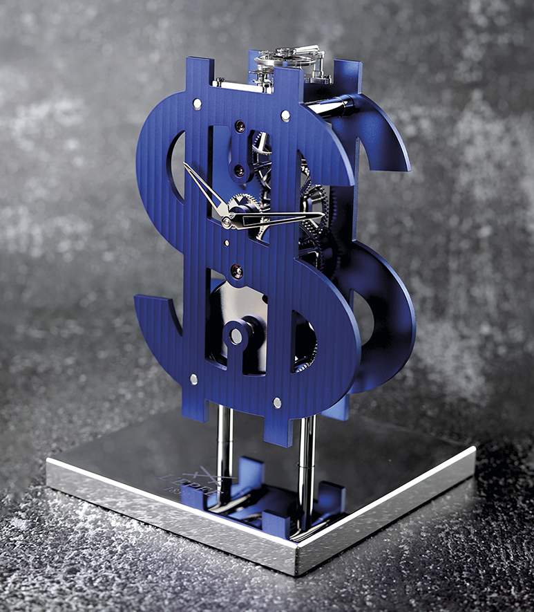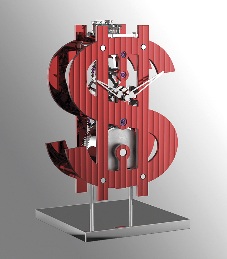 Este reloj de escritorio con forma de dólar nos recuerda la importancia de reflexionar sobre la verdadera riqueza. No es solo el dinero: también la pasión, la alegría de vivir, tener un carácter fuerte y mostrar creatividad. Prosper incorpora un movimiento propio con la firma L'Épée 1839 compuesto por 120 piezas manufacturadas con todo mimo y ensambladas por los maestros relojeros en su propio taller. El movimiento está adornado con dos láminas con la forma del símbolo del dólar, embellecidas con la decoración Côte de Genève y pulidas a mano. Más allá de su significado económico inherente, el símbolo del dólar se ha convertido en un icono cultural. Su omnipresencia en la cultura pop, la música, el cine, los dibujos animados y la vida cotidiana ha solidificado su estatus como búsqueda constante del éxito. En homenaje a los intrépidos artistas que integraron a la perfección el símbolo del dólar en sus obras, Prosper se erige como testamento de la resistencia y la determinación inquebrantable en este viaje que es la propia vida. En 1981, Andy Warhol se embarcó en una serie de dibujos y serigrafías dedicados exclusivamente al símbolo del dólar. A diferencia de la generación de artistas que le precedieron, Warhol fue el primero en rendir homenaje al dinero. En una ocasión afirmó: «Hacer dinero es un arte y trabajar es arte y los buenos negocios son el mejor arte». Conocido por simplificar la cultura popular e identificar los íconos de su época, Warhol captó la esencia del éxito, la celebridad y el glamour estadounidenses a través de su serie Dollar Signs.