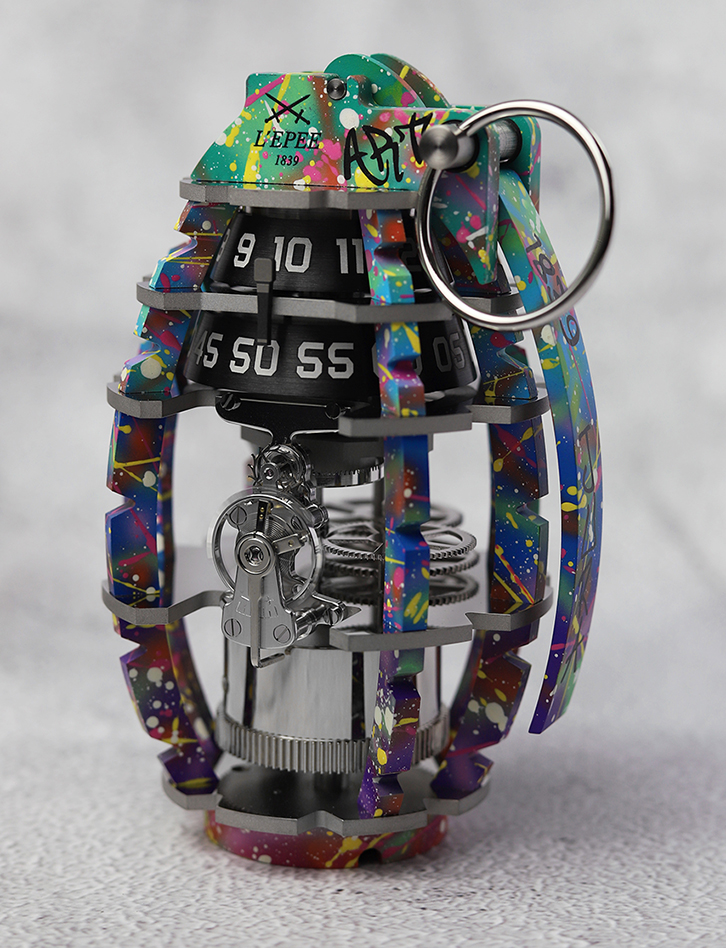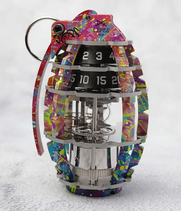 Grenade L’Epée 1839 x The Dial Artist A partir de las inspiraciones creativas de L’Epée 1839, que abarcan desde el arte contemporáneo al arte callejero, la fábrica introduce una nueva serie de piezas únicas en colaboración con The Dial Artist, explorando nuevas fronteras artísticas, combinando a la perfección diferentes artes y formas en una. En sincronización con las técnicas y pinturas de The Dial Artist, cada escultura cinética se distingue de manera única con su propio carácter distintivo, celebrando su individualidad y autenticidad. El Grenade L’Epée 1839 x The Dial Artist no es un reloj cualquiera; es un objeto artístico que nos desafía a abrazar el momento presente y aprovechar las oportunidades de la vida. Chris Alexander, The Dial Artist, caló profundamente con la narrativa creativa de L’Epée 1839 para el Grenade, viéndolo como un conmovedor recordatorio de nuestra humanidad y el incesante avance del tiempo hacia nuestro eventual fin. Esta pieza colaborativa aprovecha la oportunidad para visualizar el significado artístico del «Art-Bomb» –una forma de arte que desafía la norma y la percepción pública. Además, la cultura del graffiti se refiere al «bombardeo» como un proceso de pintar paredes u objetos con etiquetas y arrojar. El Grenade L’Epée 1839 x The Dial Artist es una celebración de dos yuxtaposiciones: Relojería de Lujo y Arte Callejero, resultando en una simbiosis de estas dos formas de arte. Ya no se ve un arma militar, sino un catalizador de alegría y amor. Una obra de arte que pone de relieve las normas culturales, desafía los estereotipos y abraza el tiempo, el arte y la paz. Esta colaboración presenta una serie de creaciones únicas, uniendo el diseño y el movimiento «in-house» del Grenade de L’Epée 1839, con la pericia del trabajo de pintura de The Dial Artist, todo ello sintetizando la esencia de la individualidad y la naturaleza efímera del tiempo.