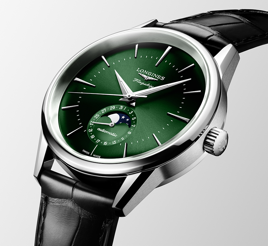 La caja de acero inoxidable con fondo atornillado tiene un diseño sobrio y atemporal y un diámetro de 38,5 mm. Presenta un acabado satinado, con asas acortadas y biseladas que se adaptan a cualquier muñeca. Estos nuevos relojes se alimentan de un calibre L899.5 exclusivo de Longines, que incluye una espiral de silicio y componentes innovadores con lo que se consigue una resistencia a los campos magnéticos diez veces superior a la norma de referencia ISO 764. Este movimiento mecánico con cuerda automática presenta una función de fase lunar, y dispone de una reserva de marcha de hasta 72 horas.