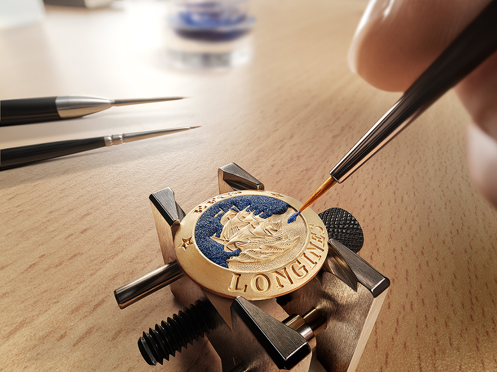 Desde el lanzamiento de la colección Flagship en 1957, cada modelo luce en el fondo de la caja un medallón de oro de 18 quilates con la forma de una carabela (emblema de la línea) surcando a toda vela un mar de esmalte azul intenso. La creación de este medallón es un legado de experiencia artesana ancestral, y sigue un proceso minucioso y exigente. Se empieza por la preparación del esmalte. Los bloques tintados previamente se reducen a polvo gracias a un pilón de ágata. A continuación se mezcla el esmalte con agua, tras lo que se aplica a mano delicadamente con la ayuda de un pincel muy fino sobre una base de oro que se ha estampado previamente. A esta fase le siguen varias cocciones al horno a 800ºC, con lo que se conseguirá la vitrificación del esmalte y una adherencia perfecta al metal precioso. Una vez fría, la pieza se somete a un lapidado preciso con lima de diamante. A continuación se pule el medallón para conseguir un acabado brillante, y se fija firmemente en el fondo de la caja. Todas estas fases le otorgan al medallón profundidad en el color, brillo y duración excepcionales, y hace de cada reloj Flagship Heritage una pieza única y preciosa.