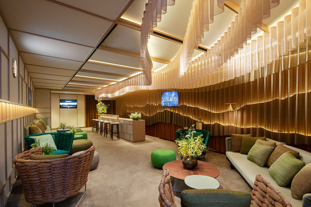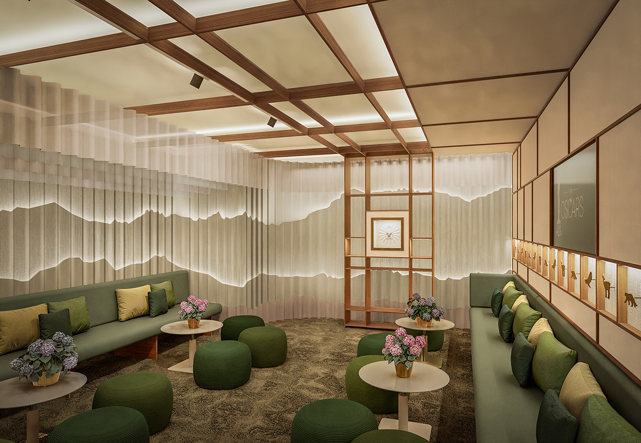 Con la mirada puesta en la sostenibilidad, Rolex ha utilizado en su diseño telas y materiales ligeros, con capas de tul vaporoso estampadas que revelan contornos fluidos y la suave paleta de colores de un paisaje de montaña, realzado por iluminación difusa a través de cortinas vaporosas. Una rejilla de madera fina enmarca el tul que se extiende a lo largo de las paredes y el techo de la Greenroom siguiendo un elegante patrón. En uno de los laterales de la sala, una secuencia de recortes representa especies autóctonas, mientras que los colores terrosos y las texturas de los sofás, las sillas y las mesas completan el lienzo.