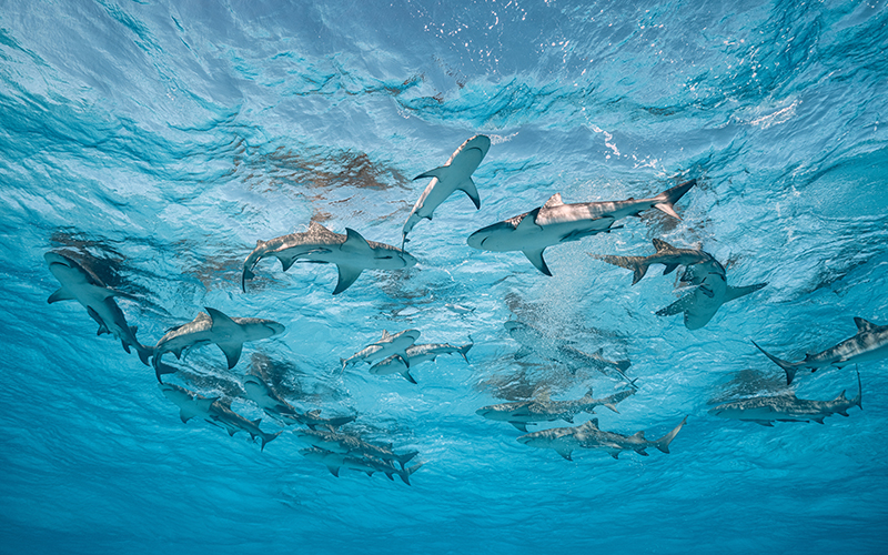 Cristina Mittermeier ha realizado más de 45 expediciones por todo el planeta, entre ellas a las Bahamas, uno de los pocos países del mundo que ha declarado santuario de tiburones a la totalidad de su hábitat marino. Un gran número de tiburones limón y de arrecife se congrega cerca de la superficie del océano. © Cristina Mittermeier
