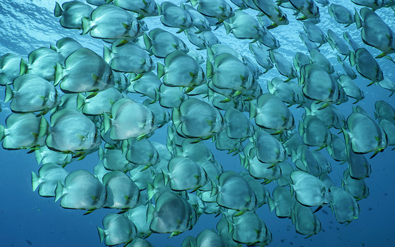 Un banco de peces murciélago nada bajo la superficie de las islas de Raja Ampat. © Cristina Mittermeier