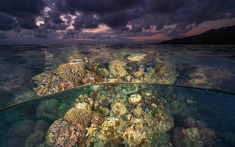 A medida que las últimas luces se desvanecen, el arrecife se ilumina con los colores del crepúsculo. «El destino de estos corales poco profundos se debate entre el calentamiento de los mares y la esperanza creciente. Lo que decidamos hacer a continuación determinará el resultado», asegura Cristina Mittermeier. © Cristina Mittermeier