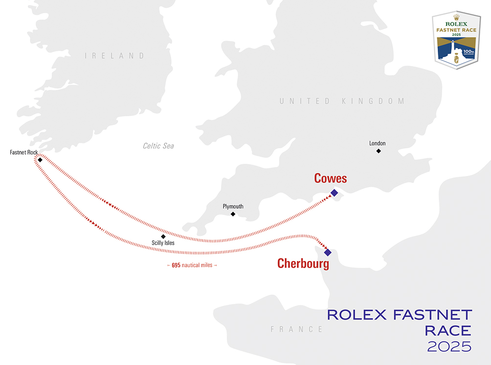 La regata comienza con el sonido de un cañonazo desde el histórico Royal Yacht Squadron en Cowes, en la Isla de Wight, otra renombrada institución asociada a Rolex desde principios de los años 1980. El primer tramo dentro de los confines del Solent occidental, entre la isla y la costa sur de Inglaterra continental, brinda una de las más espectaculares vistas en la navegación a vela, ya que la flota completa se dirige al oeste en estrecha proximidad. El siguiente tramo por el Canal de la Mancha presenta impresionantes cabos, mareas fuertes y vientos cambiantes antes de la transición en las aguas abiertas del Mar Céltico. Aquí, los rápidos sistemas meteorológicos del Atlántico a menudo ofrecen condiciones brutales y desafiantes. El momento más significativo es rodear la emblemática roca Fastnet situada frente a la costa sur de Irlanda, que marca aproximadamente la mitad del recorrido. Rodear la aislada roca con su icónico faro, anuncia el regreso pasando por las Islas de Sorlingas y hasta la meta en Cherbourg-en-Cotentin, Normandía, Francia, donde las mareas vuelven a ser críticas y pueden determinar el resultado de la regata. Cayard explica: «Hay mucho peligro y riesgo en las regatas oceánicas, entonces la preparación y saber cuándo bajar el ritmo son vitales para terminar la prueba con éxito. En la Rolex Fastnet, la ruta es limitada e independientemente del tiempo que haga, tendrás que lidiar con él. Eso la convierte en una regata dura y difícil, y probablemente sea el mayor logro en la carrera náutica de más gente que cualquier otra regata».